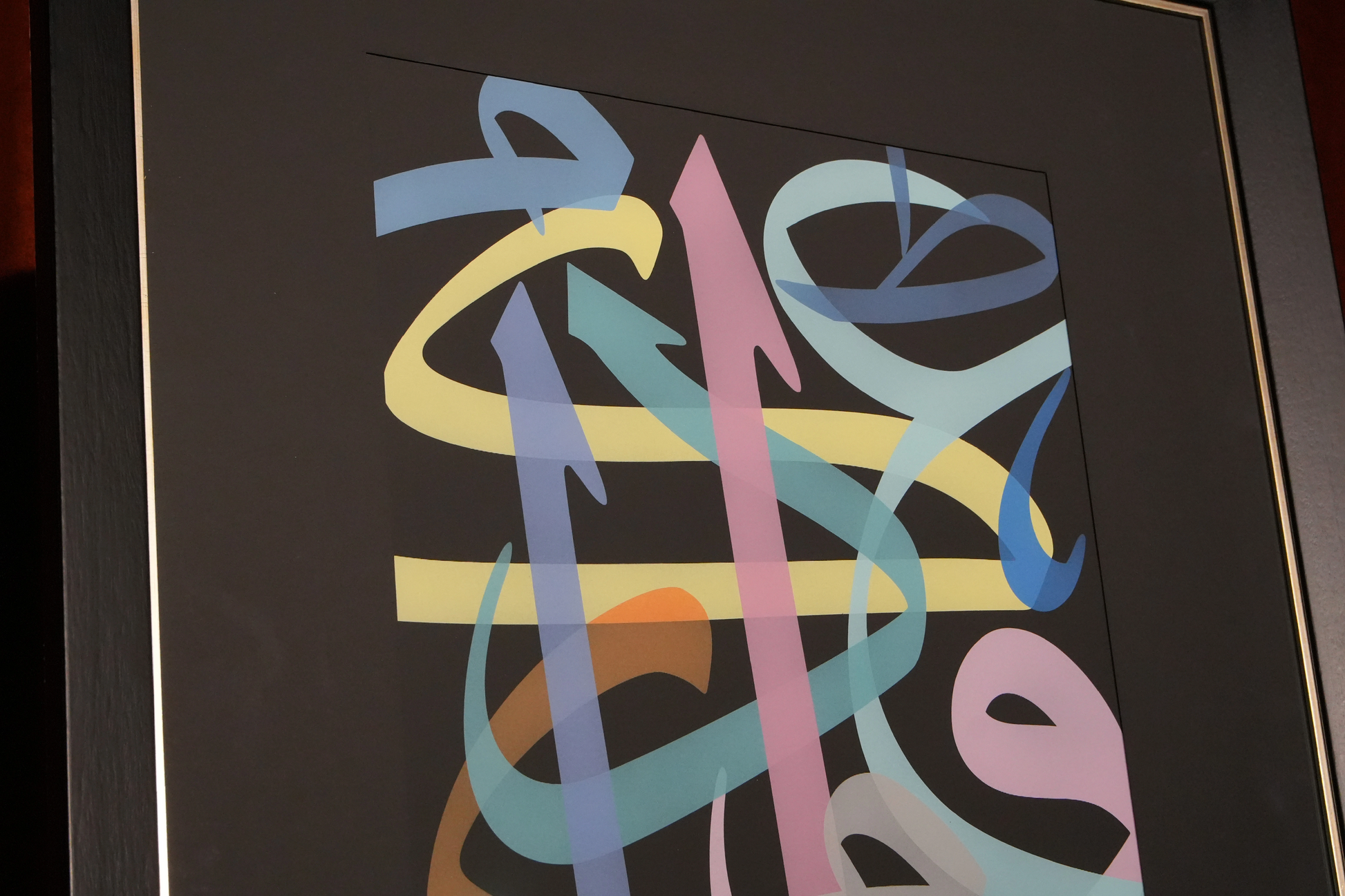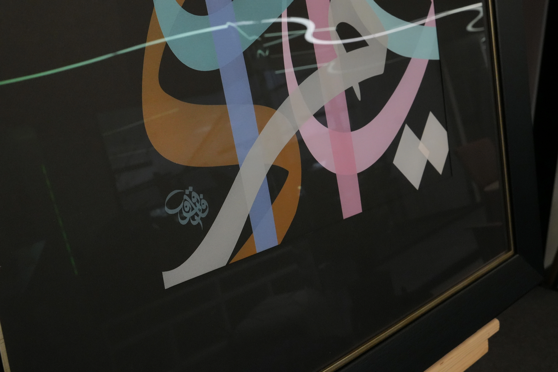 Bu eserde sanatçı, anlam kaygısı gütmeksizin, koyu bir zemin üzerinde açık renkli celî sülüs harflerden oluşan kompozisyona odaklanır. Harflerin temsil akışı içinden anlık ve altın oranı çağrıştıran kesitler önerir. Işık geçirgenliği sayesinde iki boyutlu harflerin karanlık üzerinde kristalleşmesi etkileyici bir görünüm sunar. Seçilen renk paleti de bu etkiyi güçlendirir. Celî sülüs harfin anatomisinin sanatçıya sunduğu imkânlarla yoğunlaşan leke, izleyicinin odağını çerçevenin dışına taşır ve hareket eden bir akış yanılsaması yaratır.