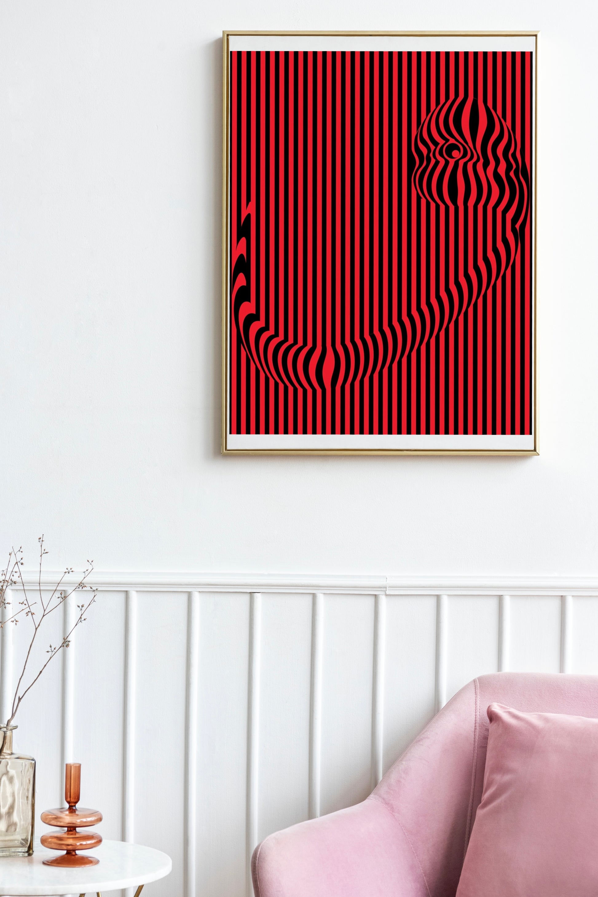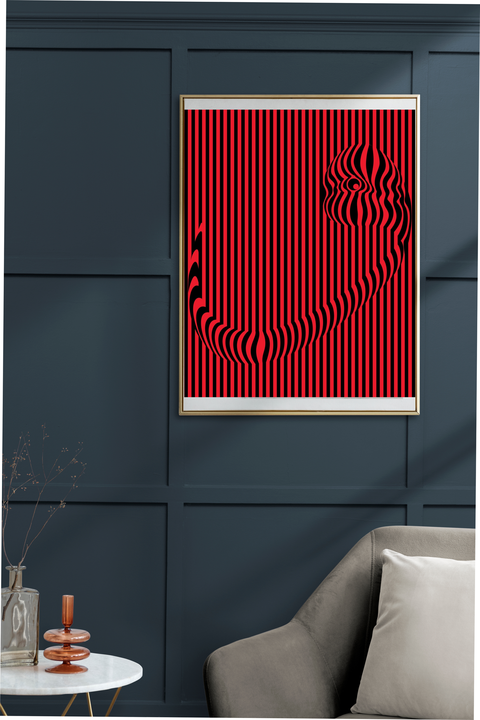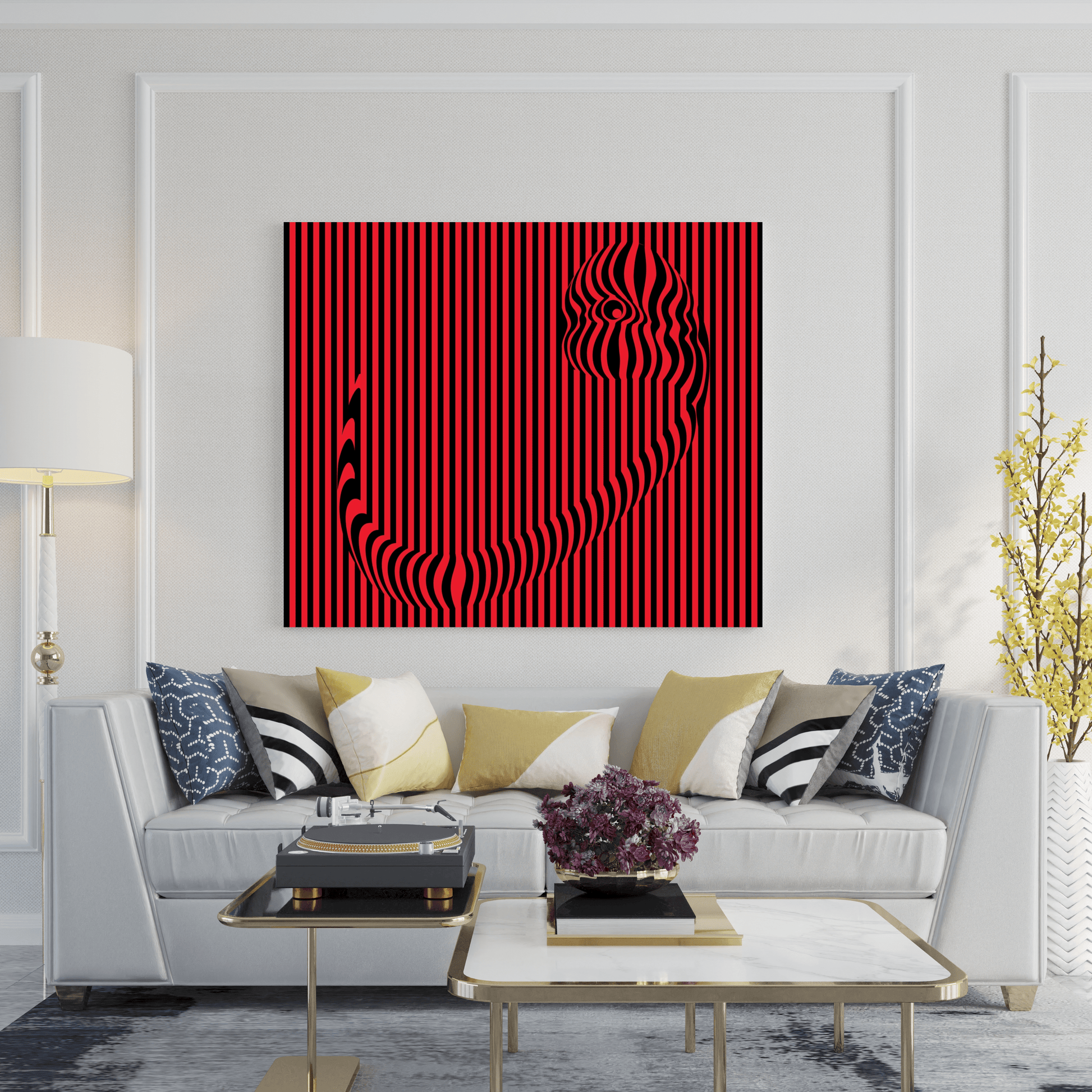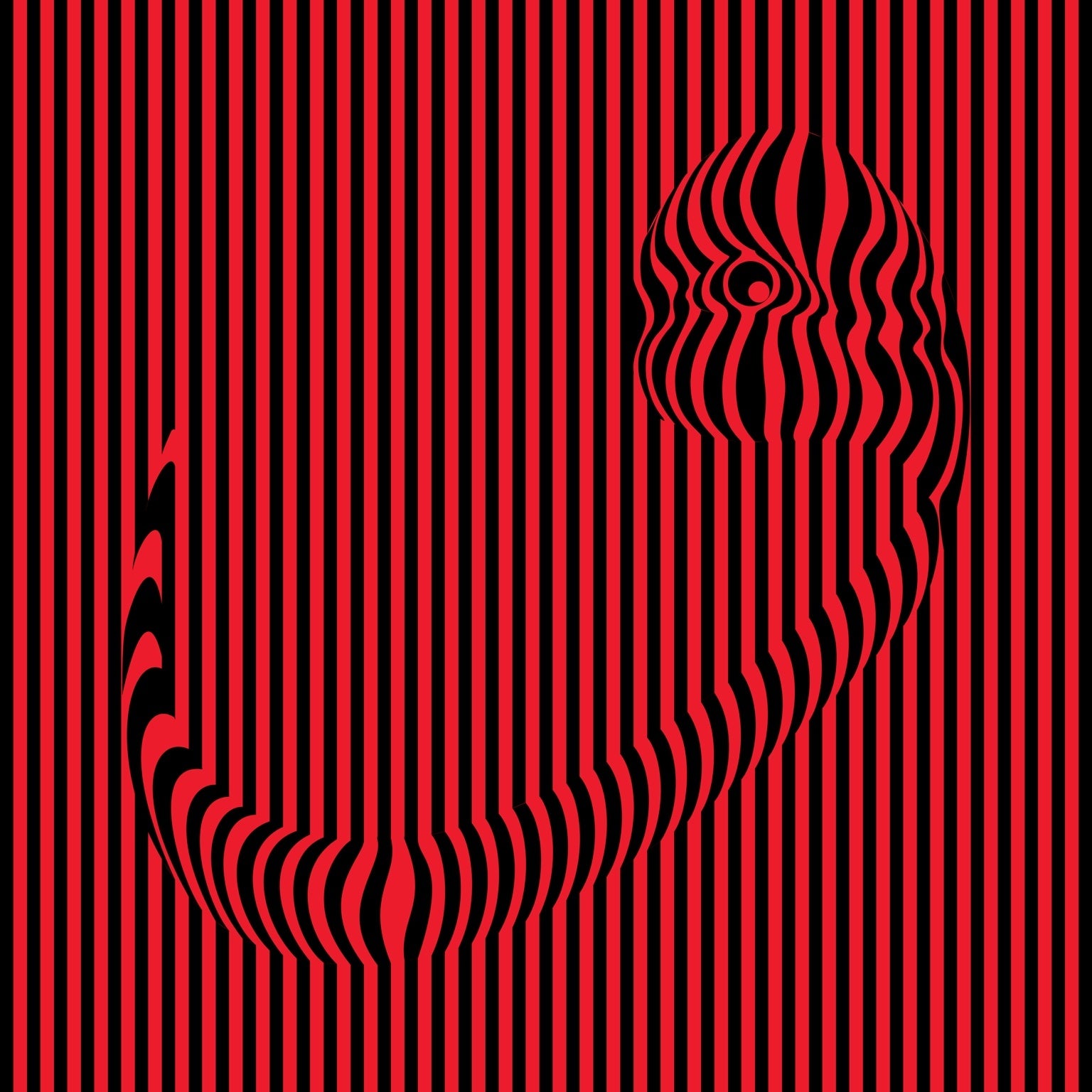- Dikey hatların ritmik akışı, yüzeyin durağanlığına karşı bir hareket hissi uyandırırken, merkezdeki kıvrımlı form, kompozisyonun içinde optik bir odak noktası oluşturur. Burada, yalnızca çizgisel bir yapı değil, aynı zamanda izleyicinin bakışının mekânda nasıl yönlendirildiğini sorgulayan bir kurgu söz konusudur. Formun içine yerleşen göz motifi, bakışın yalnızca izleyiciye ait olmadığını, aynı zamanda eser tarafından da izlendiğimizi vurgular.